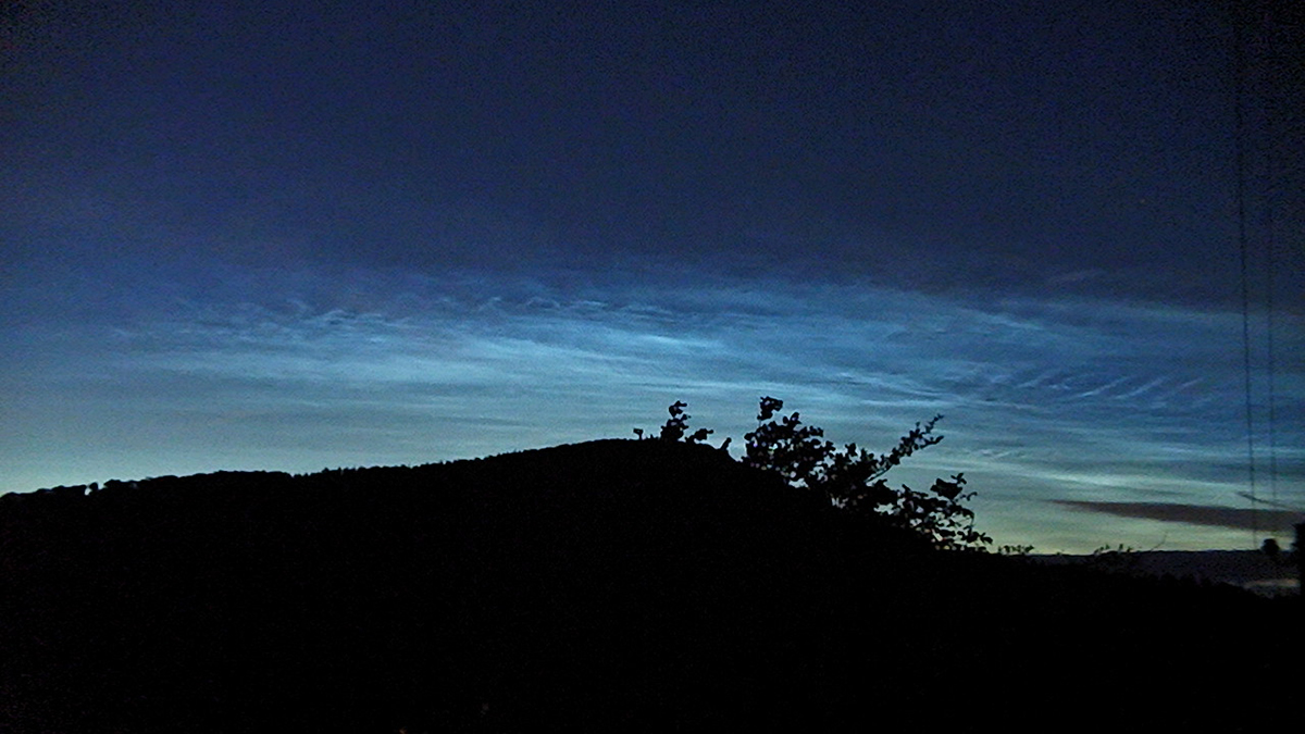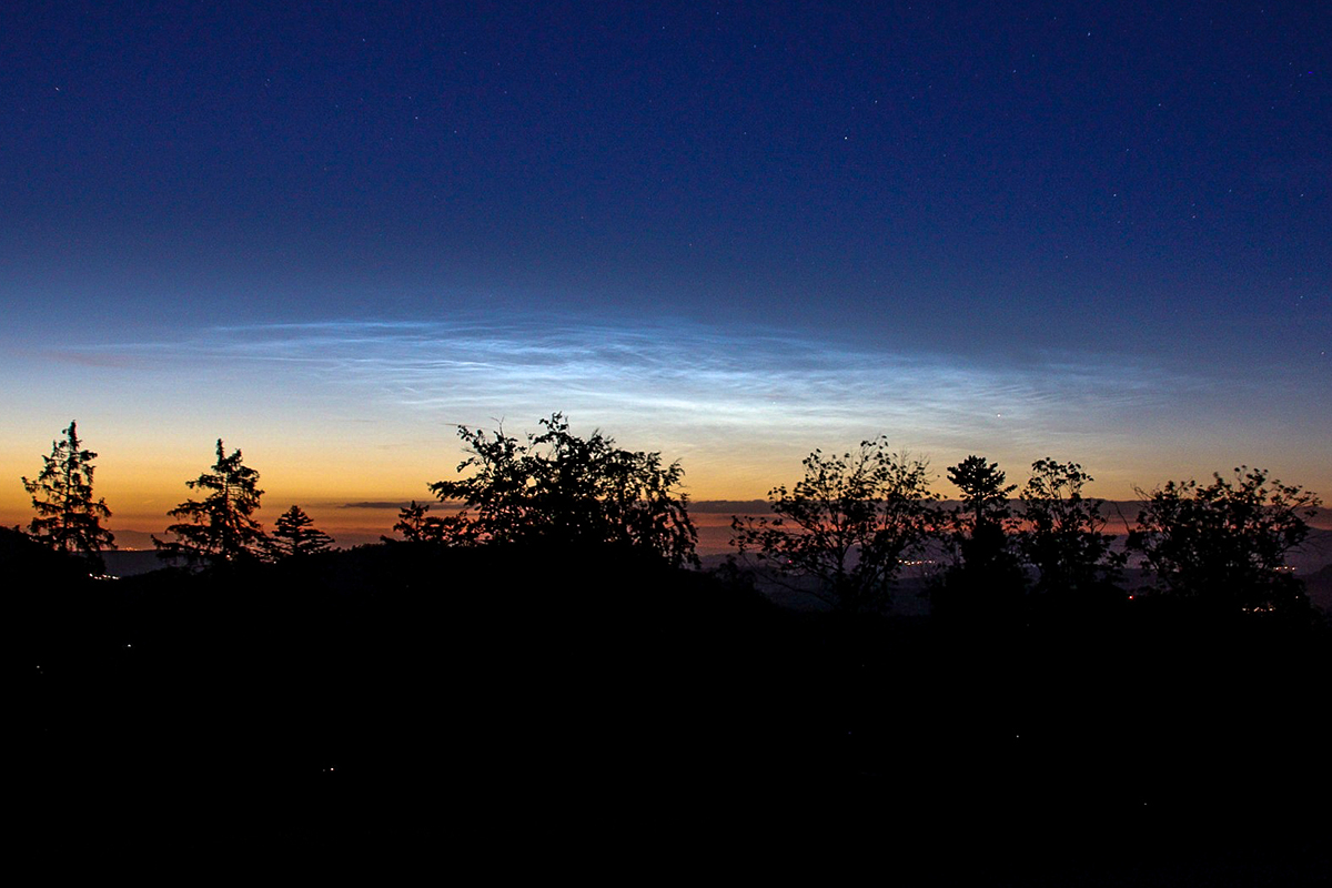 Leuchtende Nachtwolken (Noctilucent Clouds NLC) sind Ansammlungen von feinen Eiskristallen in der Mesopause (oberhalb der Mesosphäre), dort wo das Temperaturminimum der Erdatmosphäre (bis zu -140°C) erreicht wird.