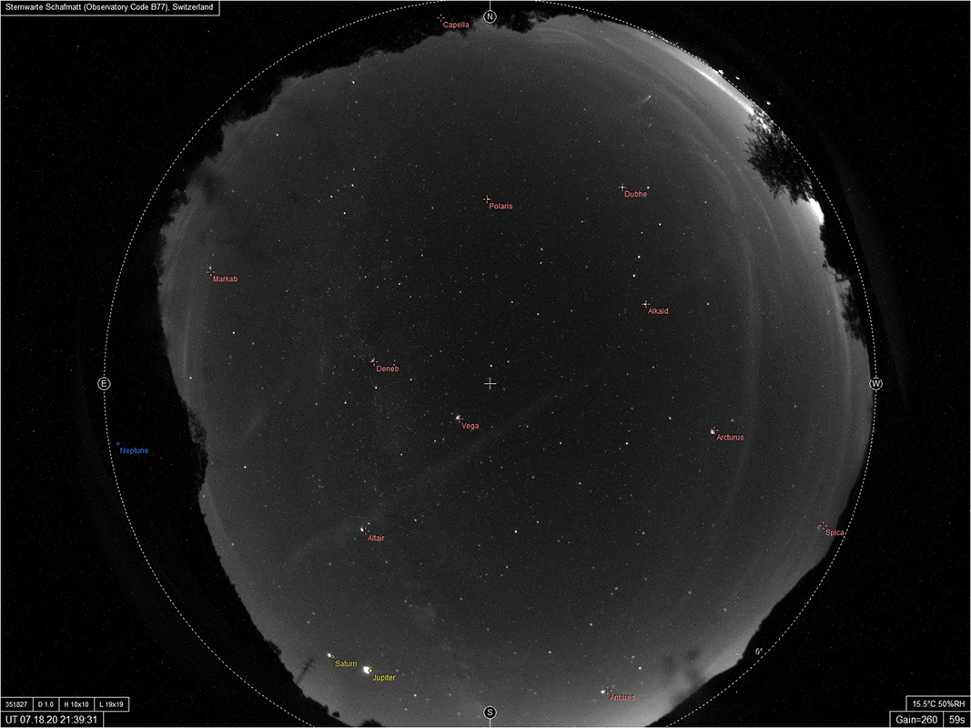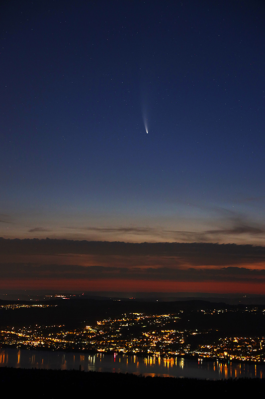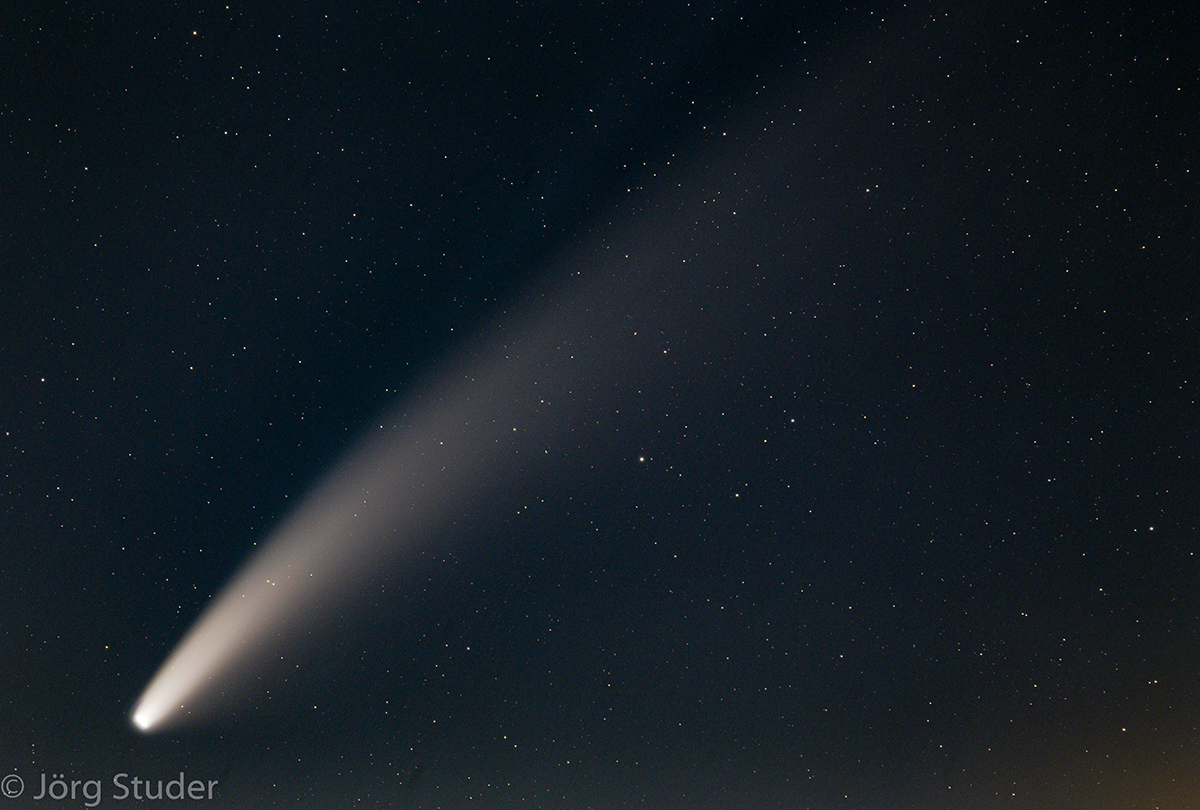 Der langperiodische Komet C/2020 F3 (NEOWISE) wurde am 27. März 2020 durch das Weltraumteleskop WISE entdeckt. Er durchlief sein Perihel (den sonnennächsten Punkt seiner Umlaufbahn) am 3. Juli 2020. Dabei entwickelte er einen ausgeprägten Schweif aus Staub- und Gasteilchen, sodass er sogar von blossem Auge gesehen werden konnte, zunächst am Morgenhimmel, ab 13. Juli 2020 am Abendhimmel. Die kürzeste Distanz zur Erde wird er am 23. Juli 2020 erreichen, er ist dann nur 0.69 AU (103 Millionen km) von uns entfernt. Der Komet weist eine Umlaufzeit von etwa 4490 Jahren auf. Infolge seiner relativ nahen Passage an den schweren Planeten Jupiter und Saturn, wird er nun eine Bahnänderung erfahren, sodass sich seine Umlaufzeit auf über 6800 Jahre verlängern wird. Inzwischen ist auch bekannt, weshalb er so hell erscheint: Der Kern des Kometen (der sog. Nucleus) ist mit einem Durchmesser von etwa 5 km aussergewöhnlich gross. Die Urheberrechte der folgenden Aufnahmen liegen bei den jeweiligen Fotografen. |