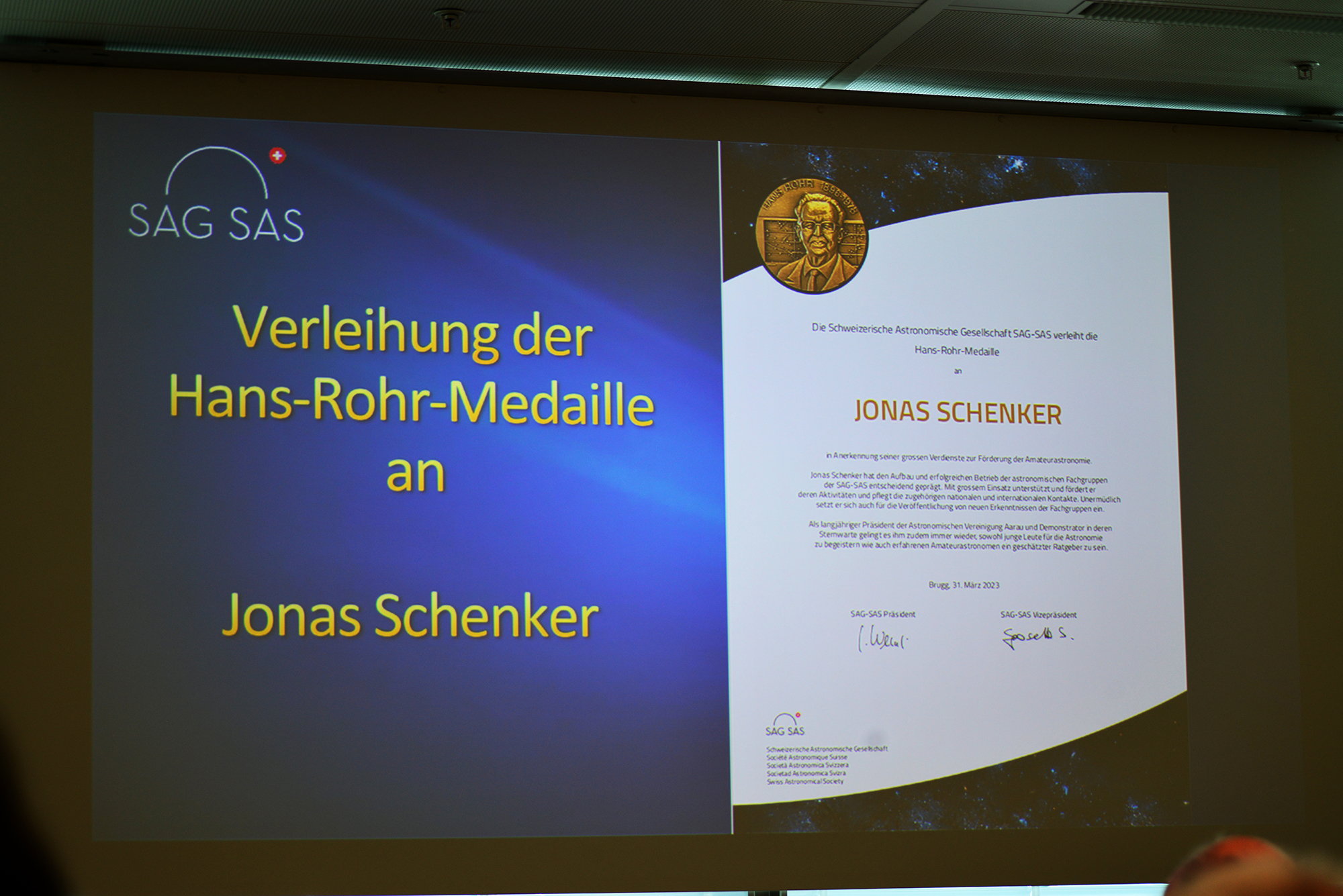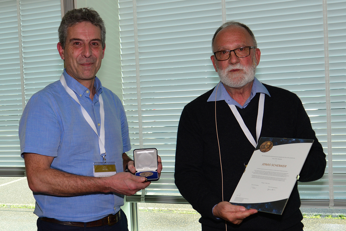 Honoris Causa: Jonas Schenker erhält an der SAG-Generalversammlung als Auszeichnung für seine Arbeit im Dienste der Amateur-Astronomie die seltene Auszeichnung mit der Hans-Rohr-Medaille - und Christian Wernli wird die SAG–SAS-Ehrenmitgliedschaft zuteil. Liebe Sternfreunde Wie betreiben wir unser Hobby am liebsten? Liegen wir nachts im Liegestuhl und betrachten dabei die funkelnde Unendlichkeit von blossem Auge? Gehen wir gezielt auf Meteorjagd oder benutzen wir ein Teleskop, um damit die in Dekaden schwankenden Abstände der unzähligen Doppelsterne zu messen? Schätzen oder messen wir die Lichtschwankungen von Pulsationsveränderlichen oder Bedeckungsveränderlichen? Bezeichnen wir uns gar als Asteroidenjäger oder wollen wir eher nach dem flüchtigen Aufleuchten der sich im Sonnenlicht auflösenden Schweifsterne suchen? Beobachten wir den Sonnenfleckenzyklus, analysieren wir das Sonnenspektrum oder das Spektrum ferner Sterne und Galaxien? Bilden wir die lichtschwachen Farben unseres Universums in prächtigen Himmelsaufnahmen ab oder gehen wir auf die Pirsch nach Exoplaneten? Es ist heute fast unmöglich, all die verschiedenen Aktivitäten der Sternliebhaber wiederzugeben. Unlängst sind die Amateure gar in Bereiche der Profiastronomen vorgestossen und bearbeiten gemeinsam mit diesen in «Citizens-Science-Projekten» die wissenschaftlichen Schwerpunktgebiete, welche die moderne astronomische Forschung und Raumfahrt hervorbringt und zur Mitarbeit aufruft. Das sinnvolle Bündeln der unterschiedlichen Tätigkeitsfelder der Schweizer Amateure in gemeinsamen Fachgruppen machte sich Jonas Schenker in der SAG zur Aufgabe. Mit einer klaren Vision und unermüdlichem Einsatz forderte und förderte er in den letzten Jahren den aktiven Austausch und das Vernetzen der Schweizer Amateurszene über alle Sprachregionen hinweg! In nicht weniger als 12 unterschiedlichen Fachgruppen konnte er die aktiven Amateure konstituieren - man vergleiche dazu diesen Link. Dies war eine gewaltige Leistung, und das Resultat ist absolut hervorragend. An der diesjährigen Generalversammlung vom 1. April 2023 in Brugg zeichnete der Vorstand der SAG-SAS Jonas Schenker «in Anerkennung seiner grossen Verdienste zur Förderung der Amateurastronomie» mit der Hans-Rohr-Medaille aus. Dem scheidenden SAG-SAS Präsidenten, Christian Wernli, wurde «in Anerkennung seiner wunderbar stabilisierenden Tätigkeit samt umsichtiger Führung in unruhigen Zeiten», die SAG-Ehrenmitgliedschaft zugesprochen. Beiden AVA-Mitgliedern und jetzt auch Ehrenträgern der SAG sei unser freudiger Dank für ihr ausgezeichnetes Wirken ausgesprochen! |