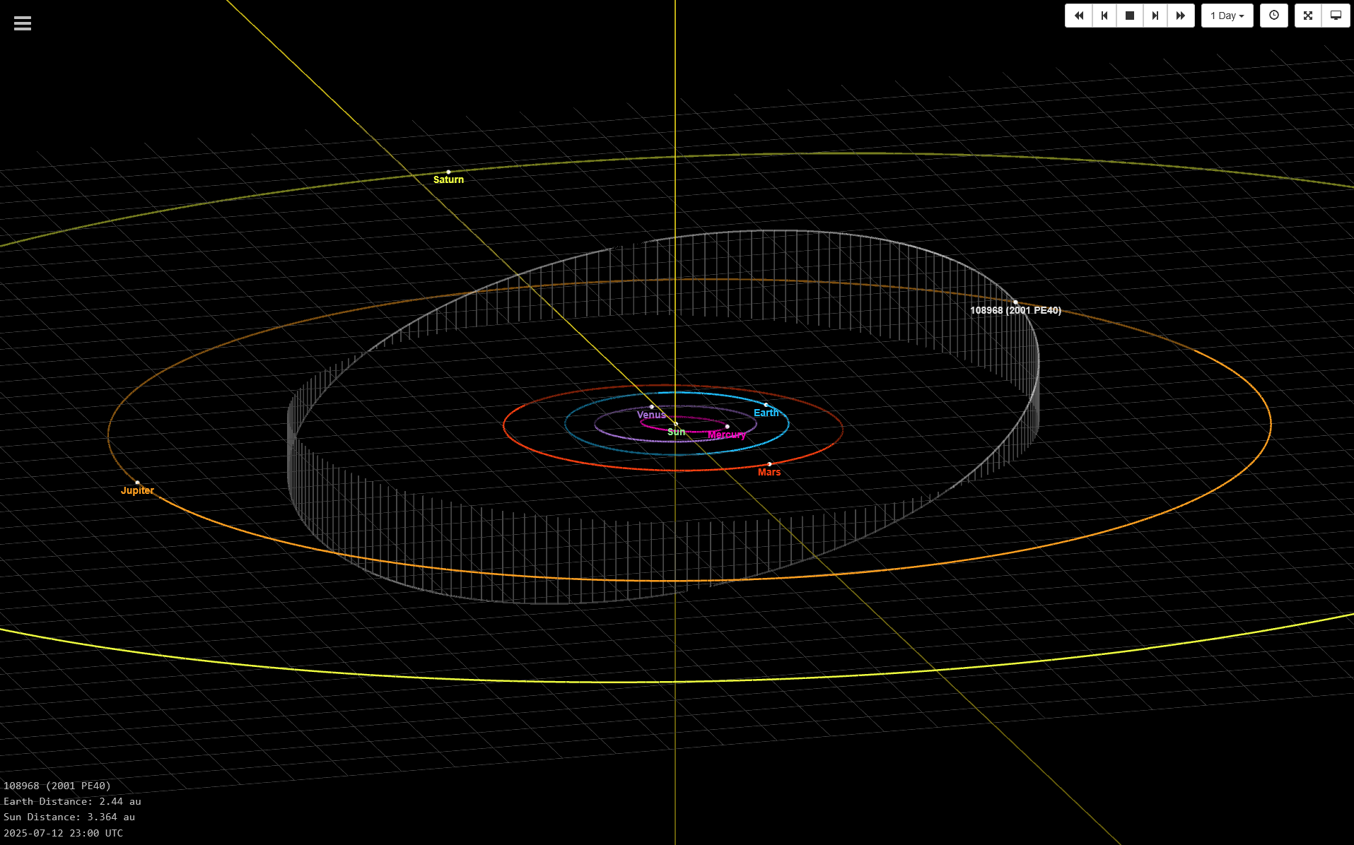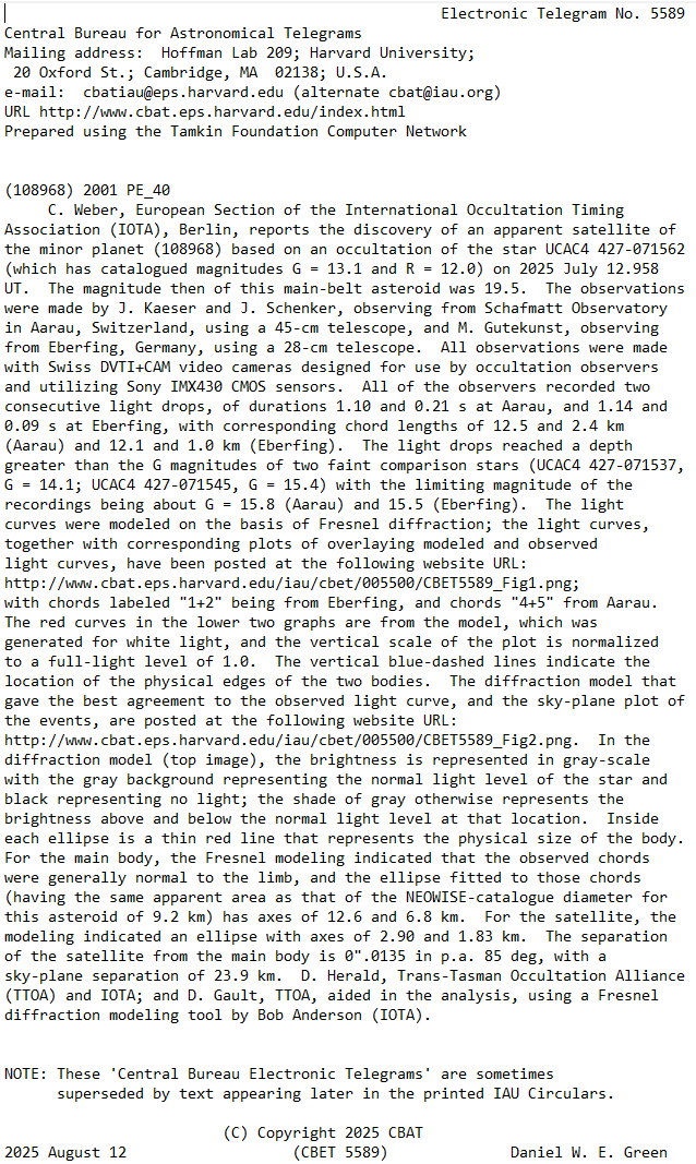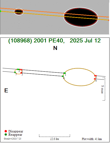Für den 12. Juli 2025 wurde die Bedeckung des Sterns UCAC4 427-071562 durch den Asteroiden (108968) 2001 PE40 vorausgesagt. Der schmale Schattenpfad auf der Erdoberfläche hatte eine Breite